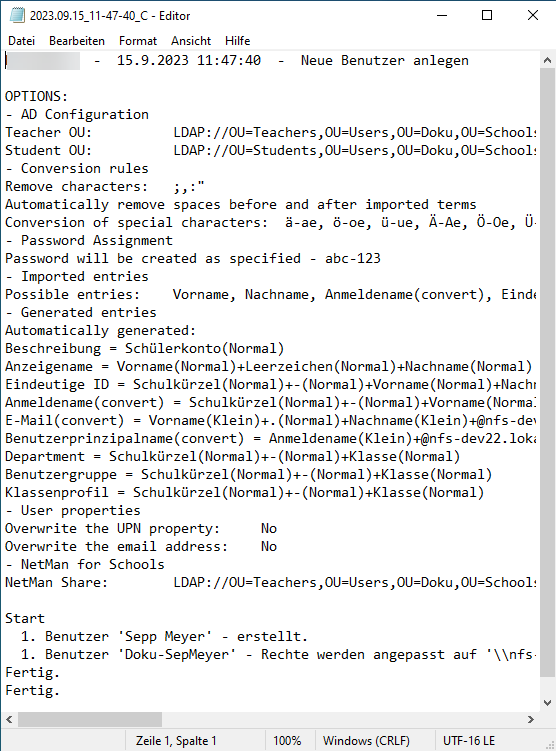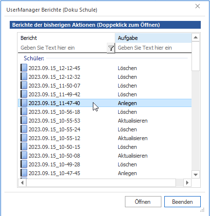 Die Auswahl der Berichte listet alle vorhandenen Einträge, getrennt nach Änderungen an Lehrern und Schülern, in chronologischer Reihenfolge. Die Namen der Berichte bestehen aus dem Datum und der Uhrzeit des Änderungszeitpunkts. Die Aufgabe beschreibt die zu diesem Zeitpunkt vorgenommene Änderung (z.B. Anlegen, Aktualisieren, Löschen). Um einen Bericht zu öffnen, markieren Sie ihn und klicken Öffnen. Der Bericht ist eine Textdatei, die in den entsprechenden Editor geladen wird.